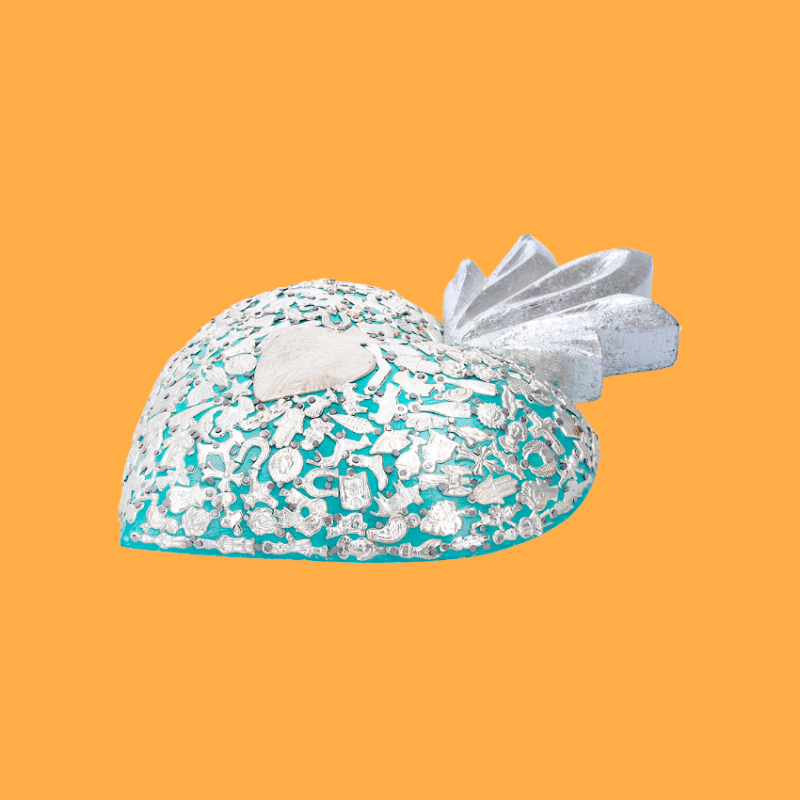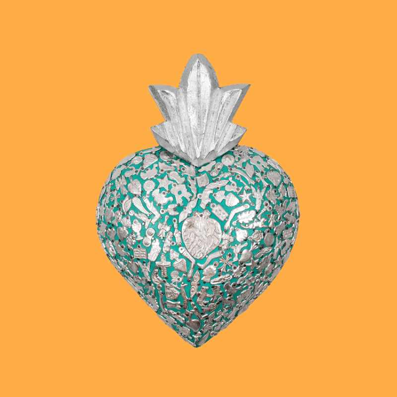 Maxi decorazione murale a cuore fiammeggiante in 3D, completamente adornata da ciondoli devozionali Milagros unici, placcati in oro o argento, applicati manualmente e inchiodati alla base in legno. Ex Voto - Amuleti Portafortuna.