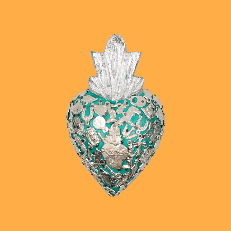 Decorazione da parete con cuore fiammeggiante in 3D, completamente adornata da ciondoli devozionali Milagros placcati in oro o argento, applicati manualmente e inchiodati alla base in legno. Ex Voto - Amuleti Portafortuna.