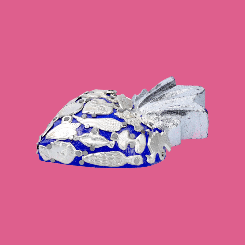 Mini decorazione murale a cuore fiammeggiante in 3D, completamente adornata da ciondoli devozionali Milagros placcati in oro o argento, applicati manualmente e inchiodati alla base in legno. Ex Voto - Amuleti Portafortuna.