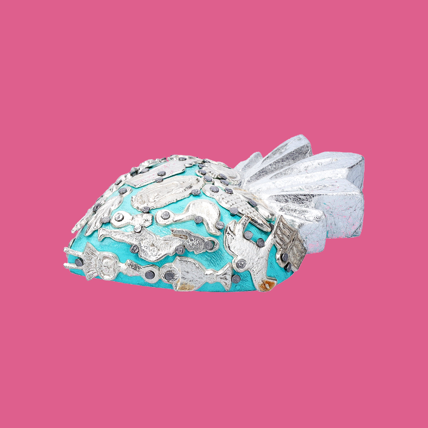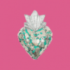 Mini decorazione murale a cuore fiammeggiante in 3D, completamente adornata da ciondoli devozionali Milagros placcati in oro o argento, applicati manualmente e inchiodati alla base in legno. Ex Voto - Amuleti Portafortuna.