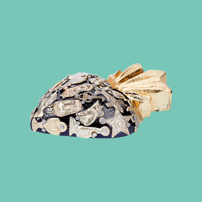 Mini decorazione murale a cuore fiammeggiante in 3D, completamente adornata da ciondoli devozionali Milagros placcati in oro o argento, applicati manualmente e inchiodati alla base in legno. Ex Voto - Amuleti Portafortuna.