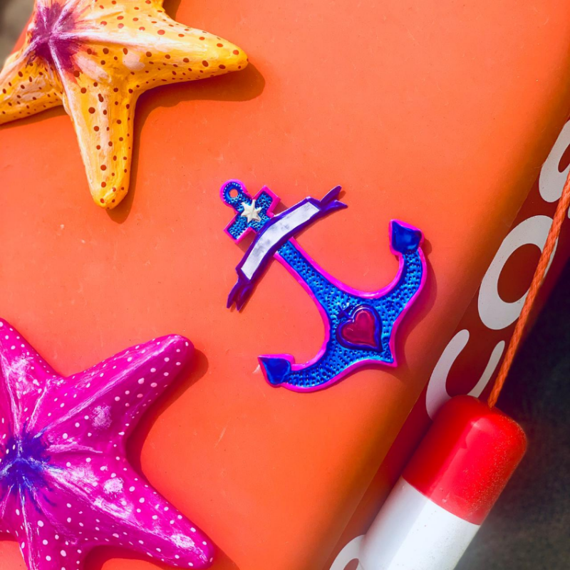 Decorazione da parete a forma di ancora in stile tatuaggio, punzonata in bassorilievo. Ex Voto - Amuleti Portafortuna.
