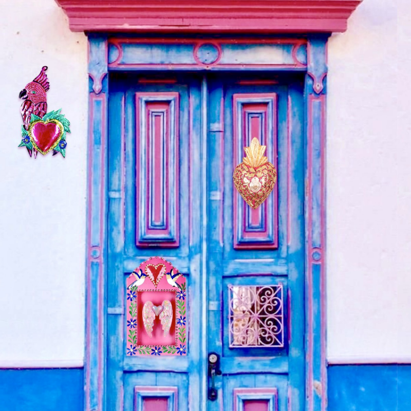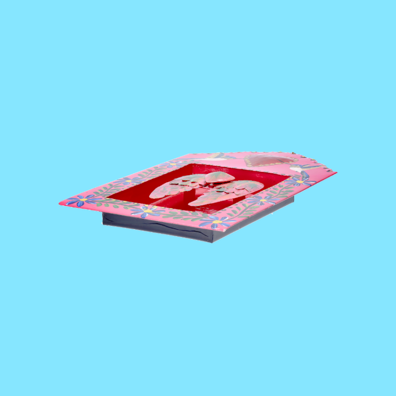 Cornice decorativa da parete 3D extra-large con cuore alato centrale. Dipinta a mano con un disegno floreale sui lati e un colibrí volante sulla parte superiore, questa cornice è un omaggio alla libertà e alla vita. Il colibrí simboleggia la gioia, la libertà e la capacità di superare le difficoltà. Lo stile è senza finestra di vetro.