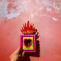 Teca decorativa da parete 3D quadrata della Virgen de Guadalupe con maxi fiamma. La vetrata può essere aperta per esprimere le proprie preghiere a Maria. Completamente dipinto a mano, questo stile è particolarmente speciale per l'ulteriore miniatura interna decorata.