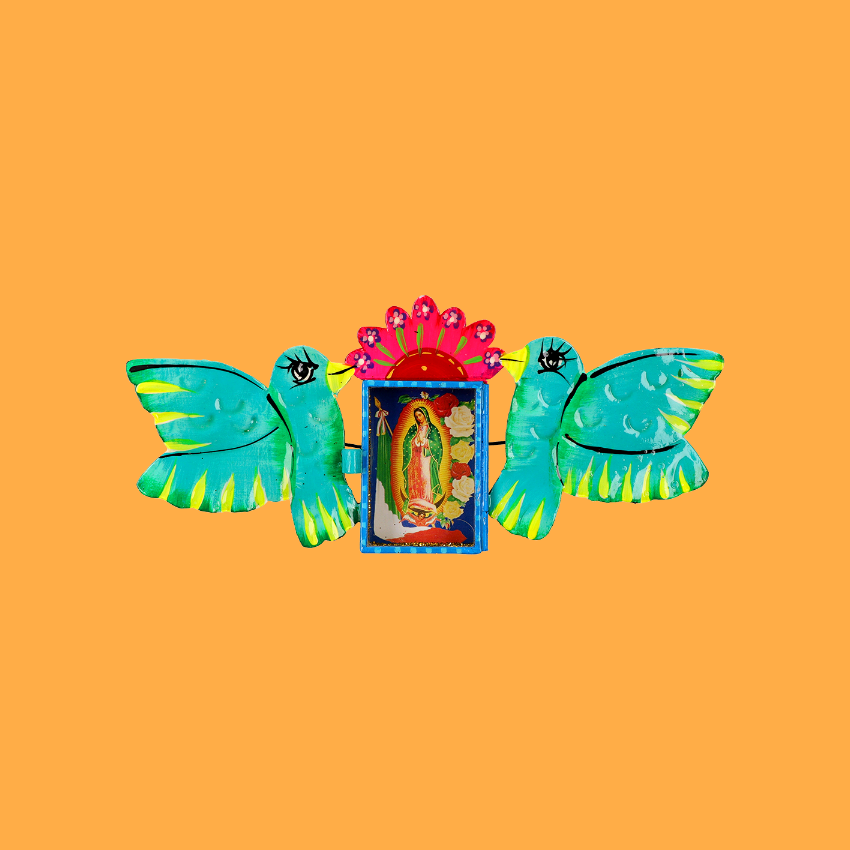 Teca decorativa da parete in 3D con doppia colomba volante e Virgen de Guadalupe centrale. La vetrata può essere aperta per esprimere le proprie preghiere a Maria. Completamente dipinto a mano e impreziosito internamente da brillantini.