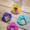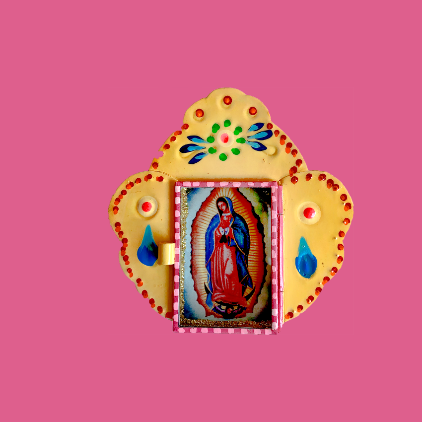 Piccola teca decorativa da parete in 3D della Virgen de Guadalupe. La vetrata può essere aperta per esprimere le proprie preghiere a Maria. Completamente dipinto a mano e impreziosito internamente da brillantini.