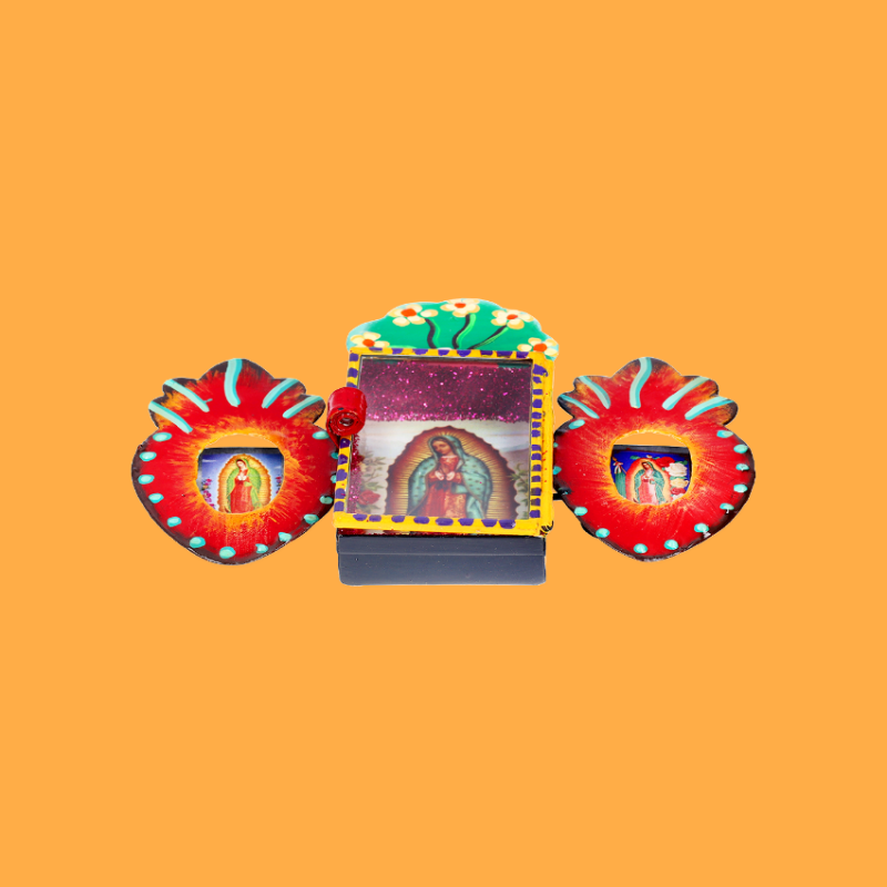 Decorazione murale 3D con tre immagini della Virgen de Guadalupe. La vetrata può essere aperta per esprimere le proprie preghiere a Maria. Completamente dipinto a mano e impreziosito internamente da brillantini.