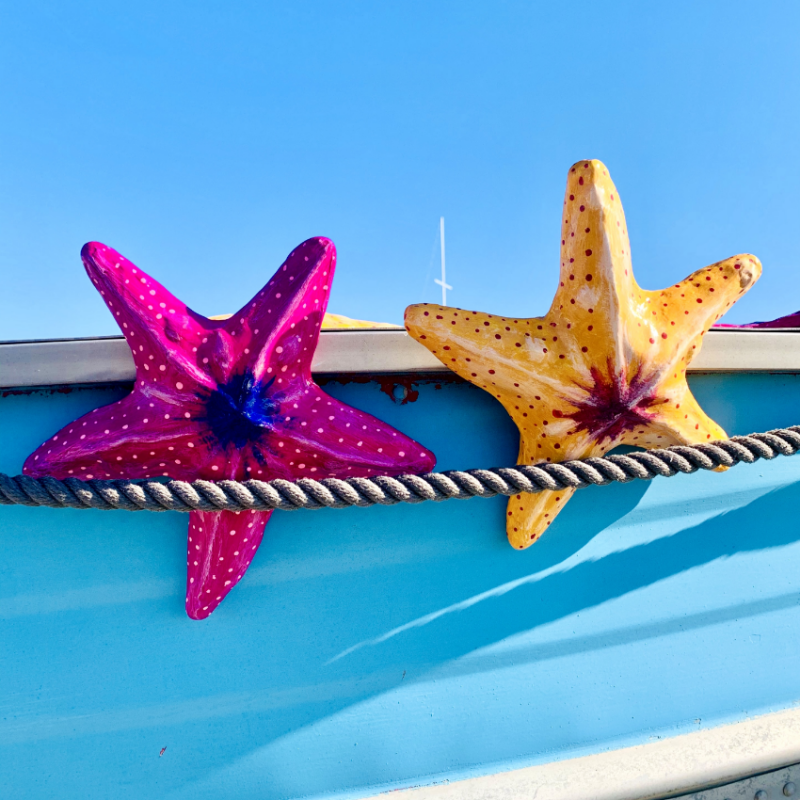 Stella marina decorativa in cartapesta dipinta a mano con colori straordinari. L'oggetto perfetto per chi ama il mare senza rubare all'ambiente marino. Ogni pezzo è unico.