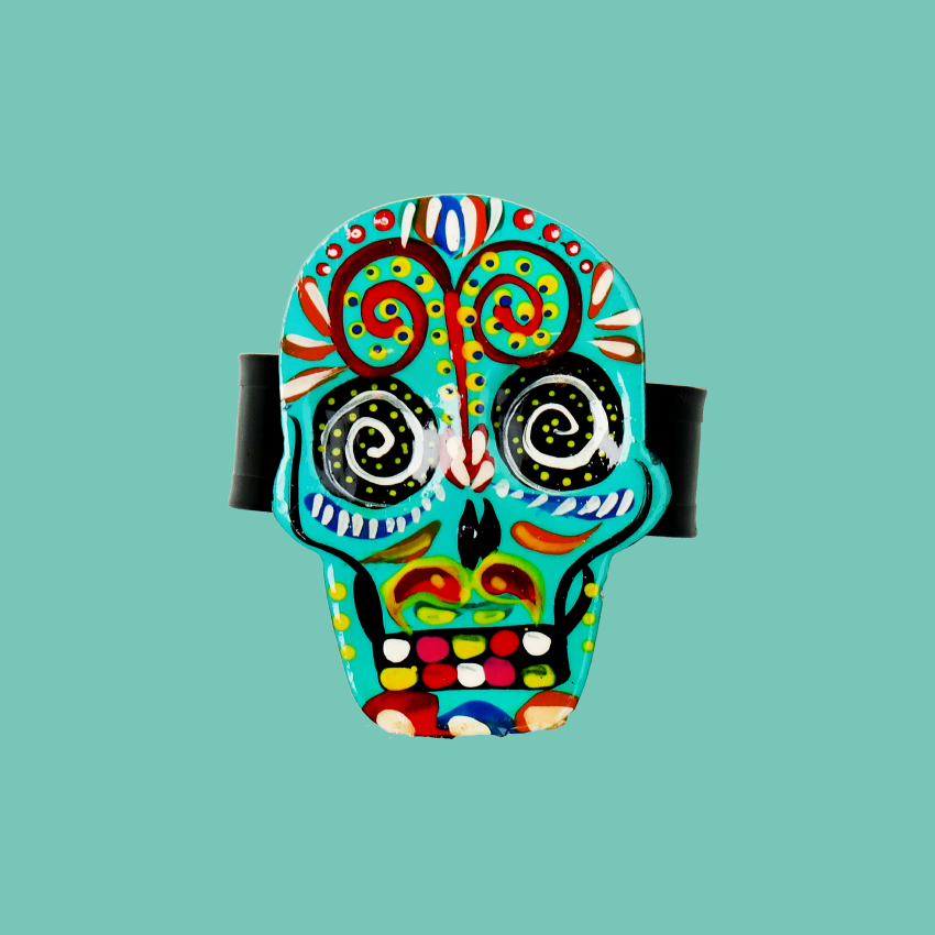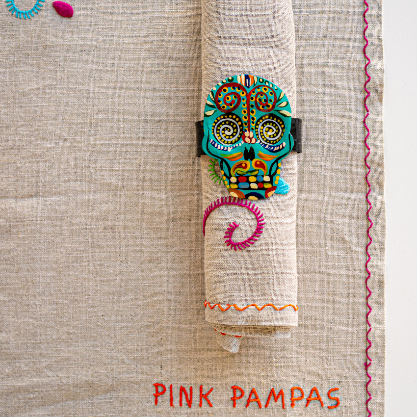 Portatovaglioli multicolore a forma di teschio punzonato in bassorilievo con dettagli tribali. Il teschio ha un significato potente: esorcizza la morte incoraggiandoci a godere appieno di una vita colorata.