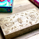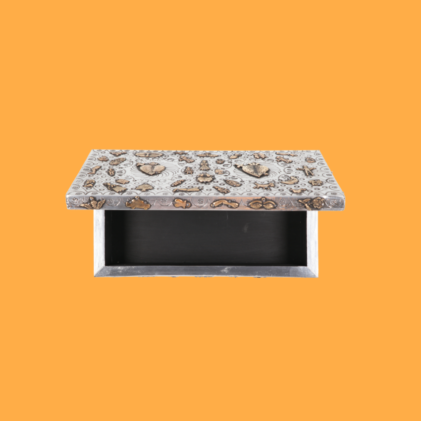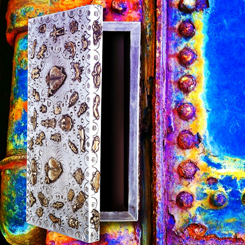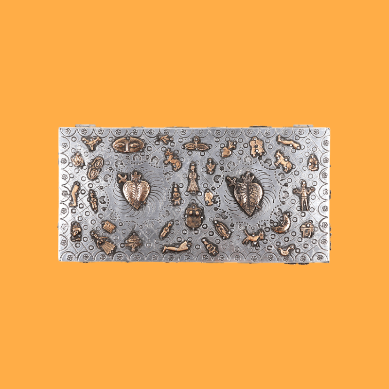 Scatola decorativa in legno intagliato a mano, ricoperta da uno strato di metallo e impreziosita da ciondoli devozionali Milagros in oro o argento, unici nel loro genere. Perfetta per rendere unico qualsiasi angolo della casa, contenente preziosi e gioielli, ma usate la vostra creatività per trovare il posto giusto. Può essere ottimo anche per nascondere i dispositivi nel vostro salotto! Ogni pezzo è unico.