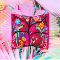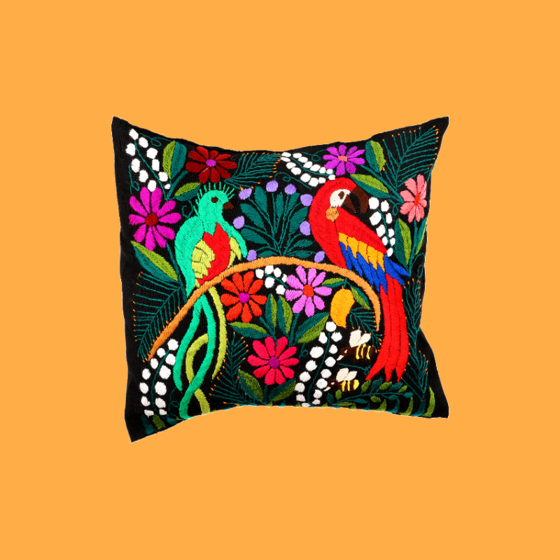 Cuscino quadrato ricamato a mano foderato su un lato e decorato con animali tropicali e natura, da una giungla ideale. Gli artigiani del Chiapas hanno mescolato estratti di frutta, piante e fiori ottenendo i colori per tingere i filati. Nessun cuscino all'interno. Lavare a mano o a secco.