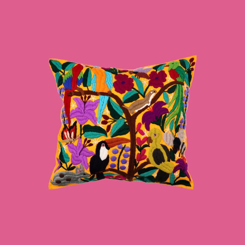 Cuscino quadrato ricamato a mano foderato su un lato e decorato con animali tropicali e natura, da una giungla ideale. Gli artigiani del Chiapas hanno mescolato estratti di frutta, piante e fiori ottenendo i colori per tingere i filati. Nessun cuscino all'interno. Lavare a mano o a secco.
