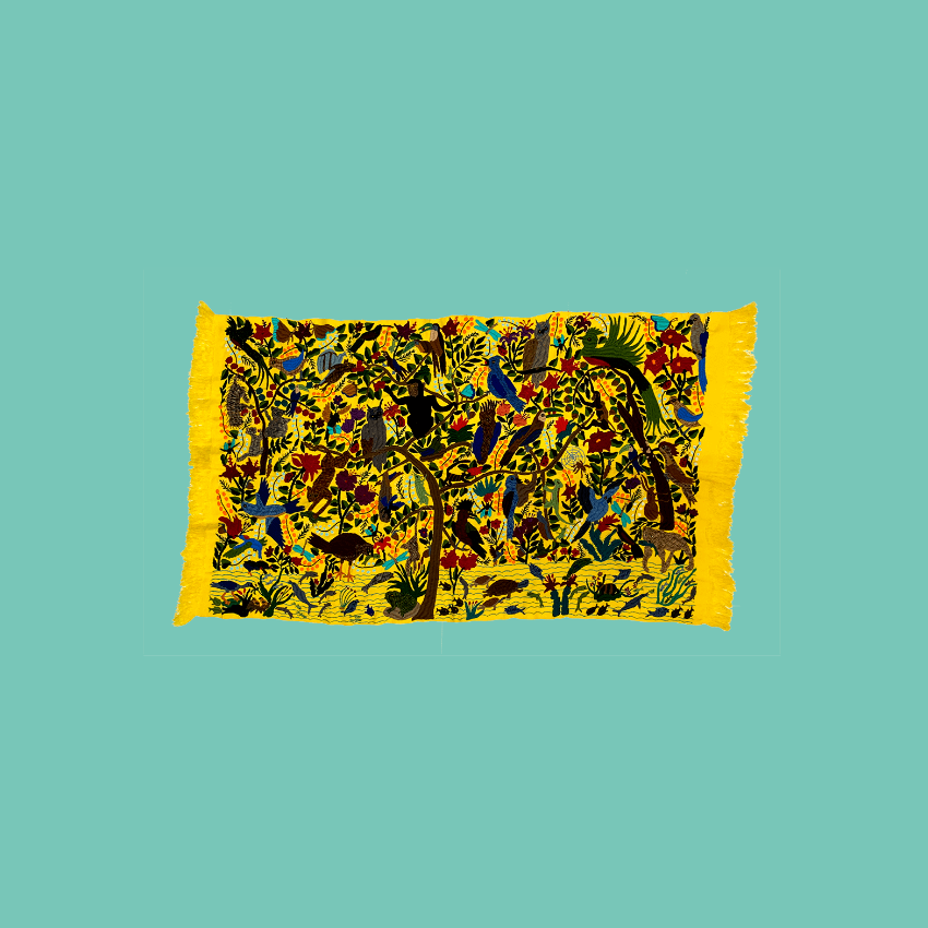 Grande arazzo multicolore ricamato a mano e completamente decorato con animali tropicali e natura, proveniente da una giungla ideale. Gli artigiani del Chiapas usano mescolare estratti di frutta, piante e fiori, ottenendo i colori per tingere i filati. Ogni arazzo può essere utilizzato in molti modi diversi: come decorazione murale, tovaglia, copriletto o divano, tappeto, coperta... basta trovare l'uso più adatto! Ogni pezzo è realizzato a telaio. Lavare a mano o a secco.