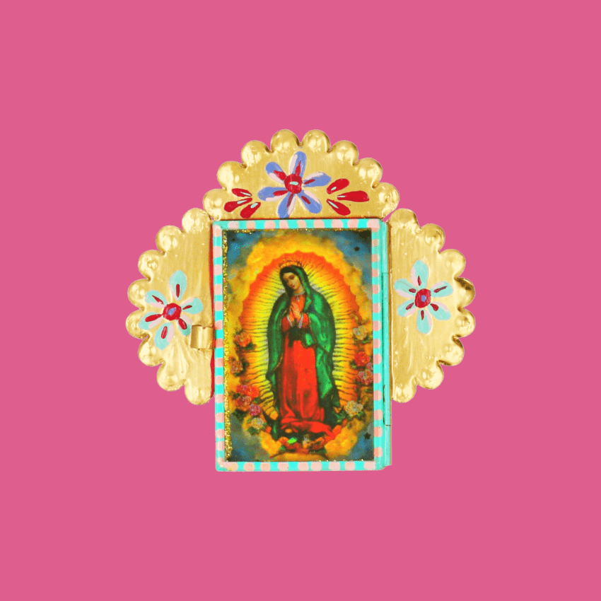 Teca decorativa da parete in 3D della Virgen de Guadalupe con disegno floreale. La finestra di vetro può essere aperta per esprimere le proprie preghiere a Maria. Completamente dipinto a mano e impreziosito internamente da brillantini.