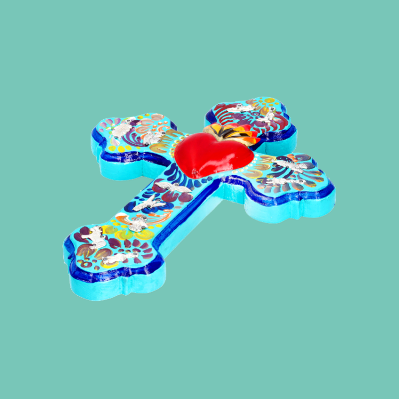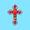Decorazione murale 3D a forma di croce con cuore centrale fiammeggiante, impreziosita da un disegno floreale dipinto a mano e da ciondoli devozionali Milagros unici applicati. La croce è un simbolo cosmico potente, che rappresenta il cerchio delle energie della natura: collega la terra al cielo e l'ovest all'est. Un prezioso amuleto per proteggere il vostro luogo. Ogni pezzo è unico. Ex Votos - Amuleti Portafortuna.