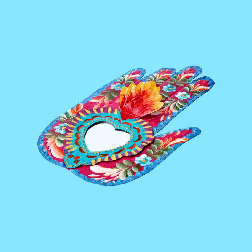 Decorazione murale a forma di mano con disegno floreale completo e specchio centrale a forma di cuore fiammeggiante. La mano è ampiamente considerata simbolo di carità ed empatia. Significa "dal cuore". Ex Votos - Amuleti Portafortuna.