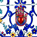 Decorazione murale lucida multicolore a forma di mano con cuore centrale, punzonato in bassorilievo. La mano è ampiamente considerata simbolo di carità ed empatia: significa "dal cuore". In diverse culture, mettere una mano sulla porta di casa significa protezione e buona fortuna. Ex Votos - Amuleti Portafortuna.