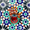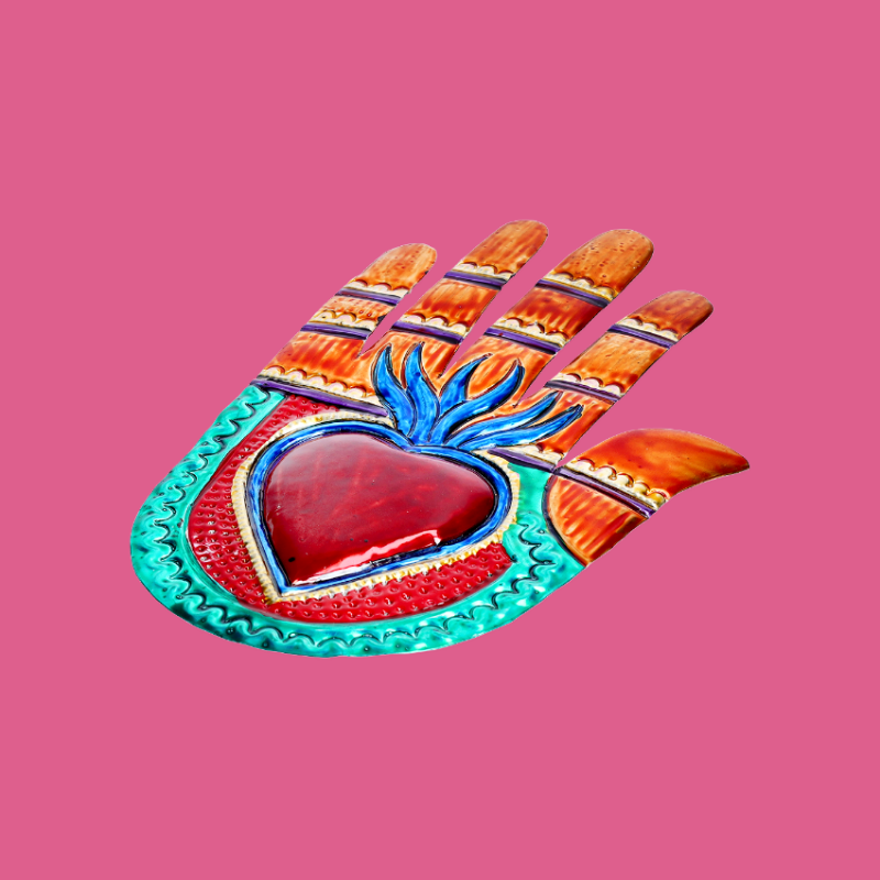 Decorazione murale lucida multicolore a forma di mano con cuore centrale, punzonato in bassorilievo. La mano è ampiamente considerata simbolo di carità ed empatia: significa "dal cuore". In diverse culture, mettere una mano sulla porta di casa significa protezione e buona fortuna. Ex Votos - Amuleti Portafortuna.