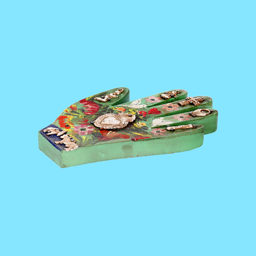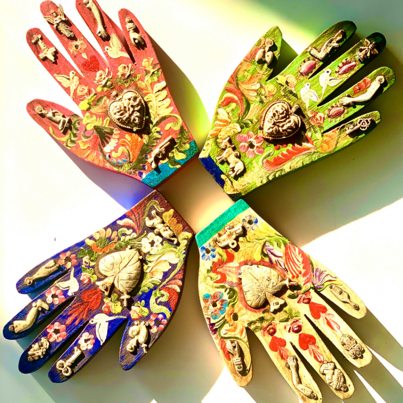 Decorazione da parete a forma di mano con disegno popolare dipinto e ciondoli votivi Milagros applicati unici nel loro genere. Ogni pezzo è diverso dall'altro. La mano è ampiamente considerata simbolo di carità ed empatia: significa "dal cuore". Ex Votos - Amuleti Portafortuna.
