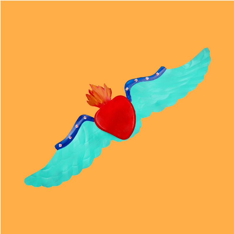 Decorazione da parete a forma di cuore fiammeggiante punzonato in bassorilievo con ali extra-lunghe, impreziosito da fiorellini decorativi sulla parte superiore. L'oggetto vuole celebrare tutte le forme dell'amore, della luce e dei pensieri positivi. Ex Voto - Amuleti Portafortuna.