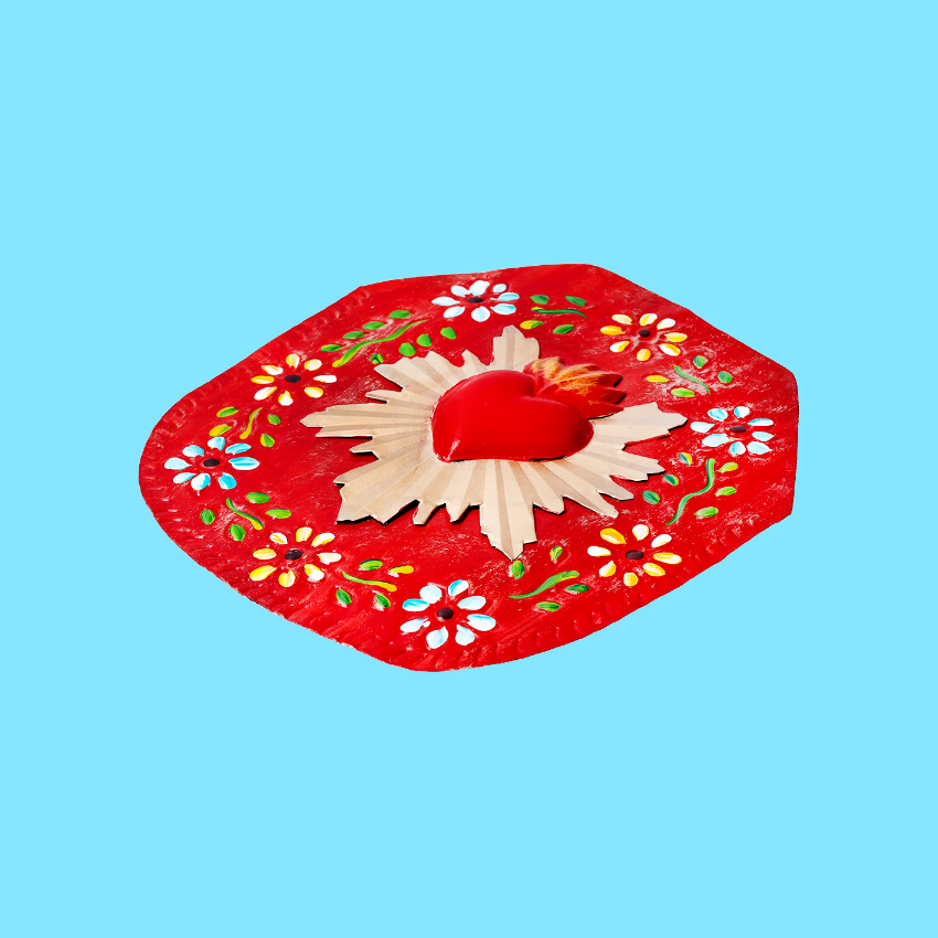 Placca circolare da parete con cuore centrale in 3D e raggi dorati, impreziosita da fiori in bassorilievo. L'oggetto vuole celebrare tutte le forme dell'amore, della luce e dei pensieri positivi. Ex Voto - Amuleti Portafortuna.