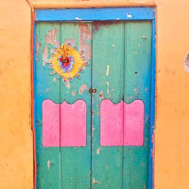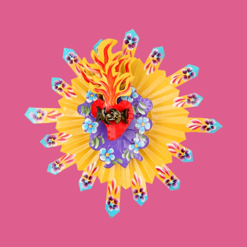 Decorazione murale 3D a triplo strato che rappresenta un sole splendente con cuore centrale fiammeggiante sulla parte superiore e design folkloristico. La luce è simbolo di vita e di tutte le vibrazioni positive che si vogliono attrarre. Ex Voto - Amuleti Portafortuna.