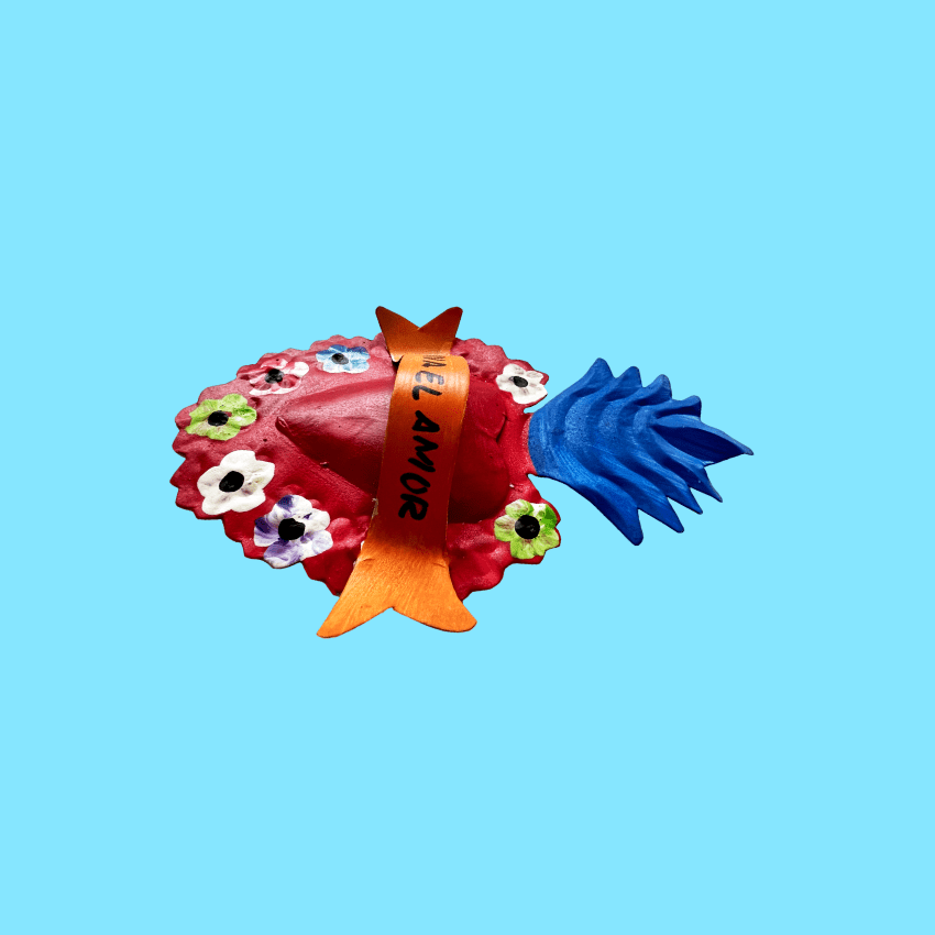 Decorazione da parete a forma di cuore multicolore con frase spagnola "Que Viva El Amor" e disegno folk. L'oggetto vuole celebrare tutte le forme dell'amore, della luce e dei pensieri positivi. Ex Voto - Amuleti Portafortuna.