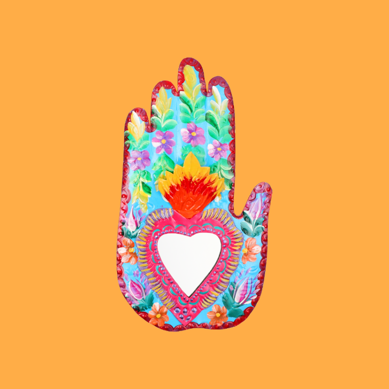 Decorazione murale a forma di mano con disegno floreale completo e specchio centrale a forma di cuore fiammeggiante. La mano è ampiamente considerata simbolo di carità ed empatia. Significa "dal cuore". Ex Votos - Amuleti Portafortuna.